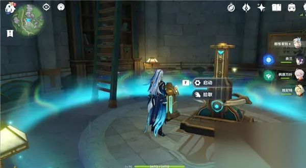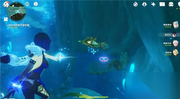 前往下层追上愚人众指挥官,如图所示把能量转移到柜子顶上的装置,然后拾取能量装置放到旁边机关去开侧门;