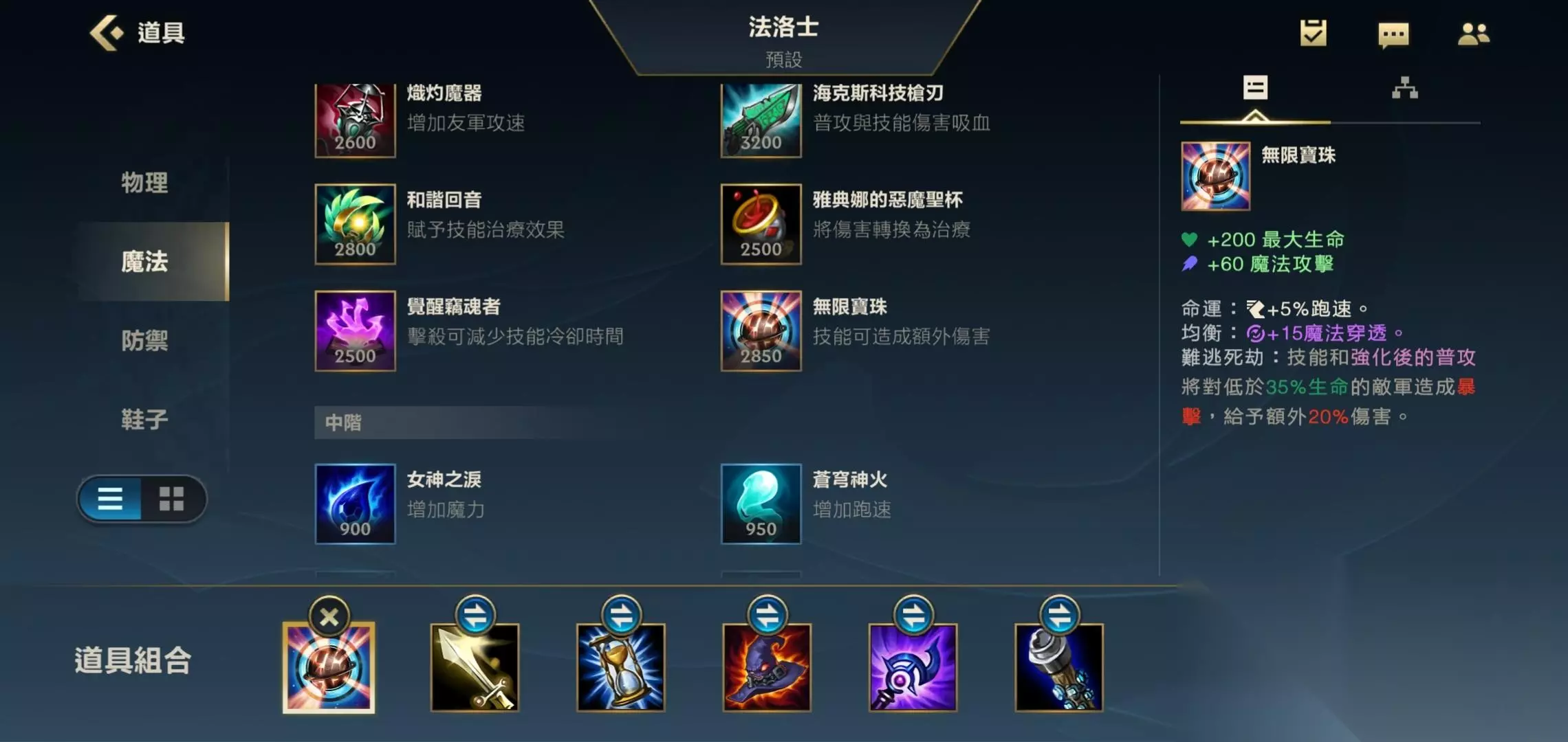 2、在敌方坦克英雄较多的情况下,出装搭配为:纳什之牙、灭世者之帽、贪婪之靴、灭妖之祸、无限法球、虚空之杖,这套出装可以增加她的攻速,技能冷却快、附带吸血效果、加移速、输出能力与穿透能力强。