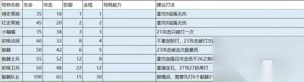 魔塔50层1-10的挑战难度相对较低,玩家只需要在前期选择合适的武器和装备就可以达成通关条件了,有很多小伙伴对此还不太清楚,接下来就让小编为大家介绍一下吧。 魔塔50层1-10怎么过 1、先从1楼杀到3楼进剧情,记得拾取三楼的钥匙,然后撞剑左方暗墙取剑。 2、再将攻击力提升至21点,降低受到的伤害,回4楼,开下侧右边门打一法师拿宝石,血瓶暂时不拿。 3、击败4楼左下角的蝙蝠得到钥匙,在第五层杀光全部的小蝙蝠,前往6层。