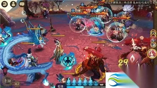 第二回合要注意开局如果输出比椒图速度快,输出就要普攻一回合,等椒图拉好链子再放大招,先击杀两侧的饿鬼,再犬神,犬舍会挡刀和反击,但是杀伤力都不大。