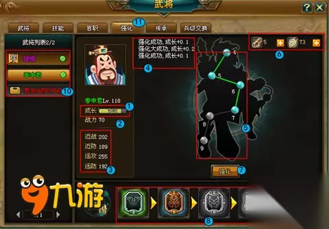 七雄Q传武将如何强化呢?七雄Q传武将强化有什么技巧呢?我们一起来看下七雄Q传武将强化技巧吧。 武将强化可以提高武将的成长,从而大大增加武将能力。 开放条件 任意一名武将达到50级时,开放武将强化功能,在“武将”界面会新生成名为“强化”的标签,点击则进入武将强化界面,如下图所示。
