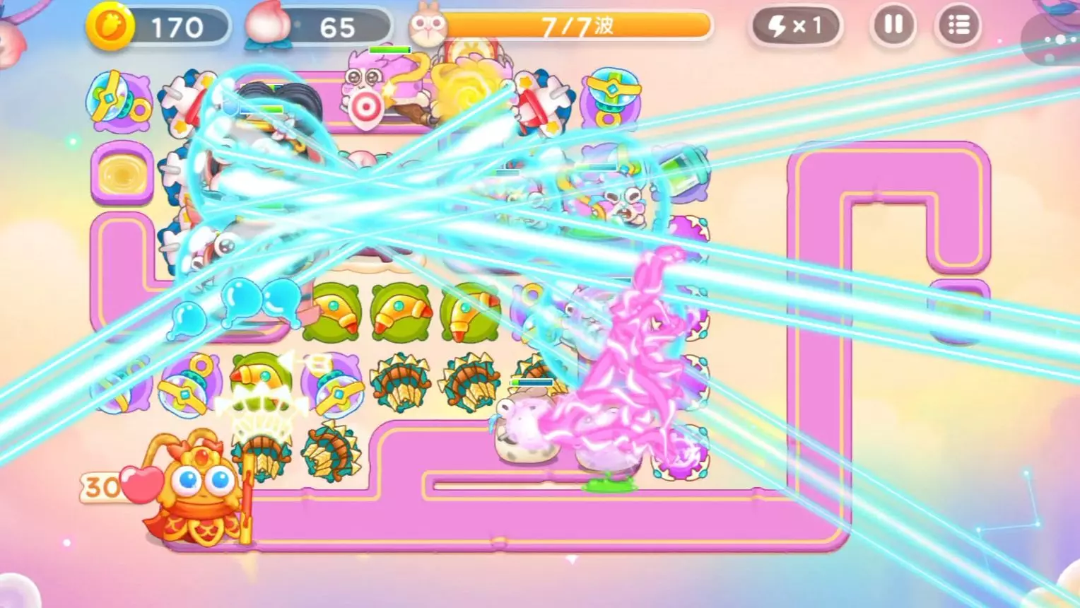 非常简单的一张图,后期只需注意仙女兔,有兔子进入魔法球的攻击范围就1倍速。最后用泡泡留仙女兔,最多留到下方的丁字路口。