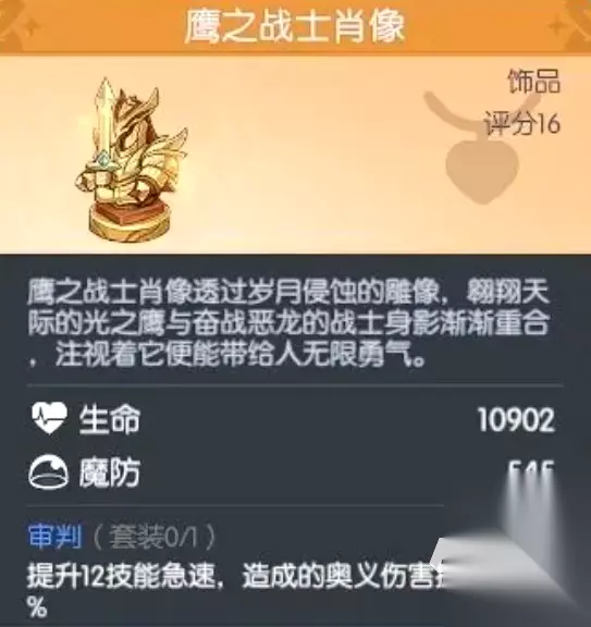 2、鹰之战士肖像 该饰品专为急速流体系设计,提供10902点生命值与545点魔法抗性,有效提升续航能力。关键特效为12点技能急速加成,配合奥义伤害20%增益,显著加快核心技能循环节奏,尤其适配依赖高频奥义触发机制的角色,如风系辅助或爆发型法师。