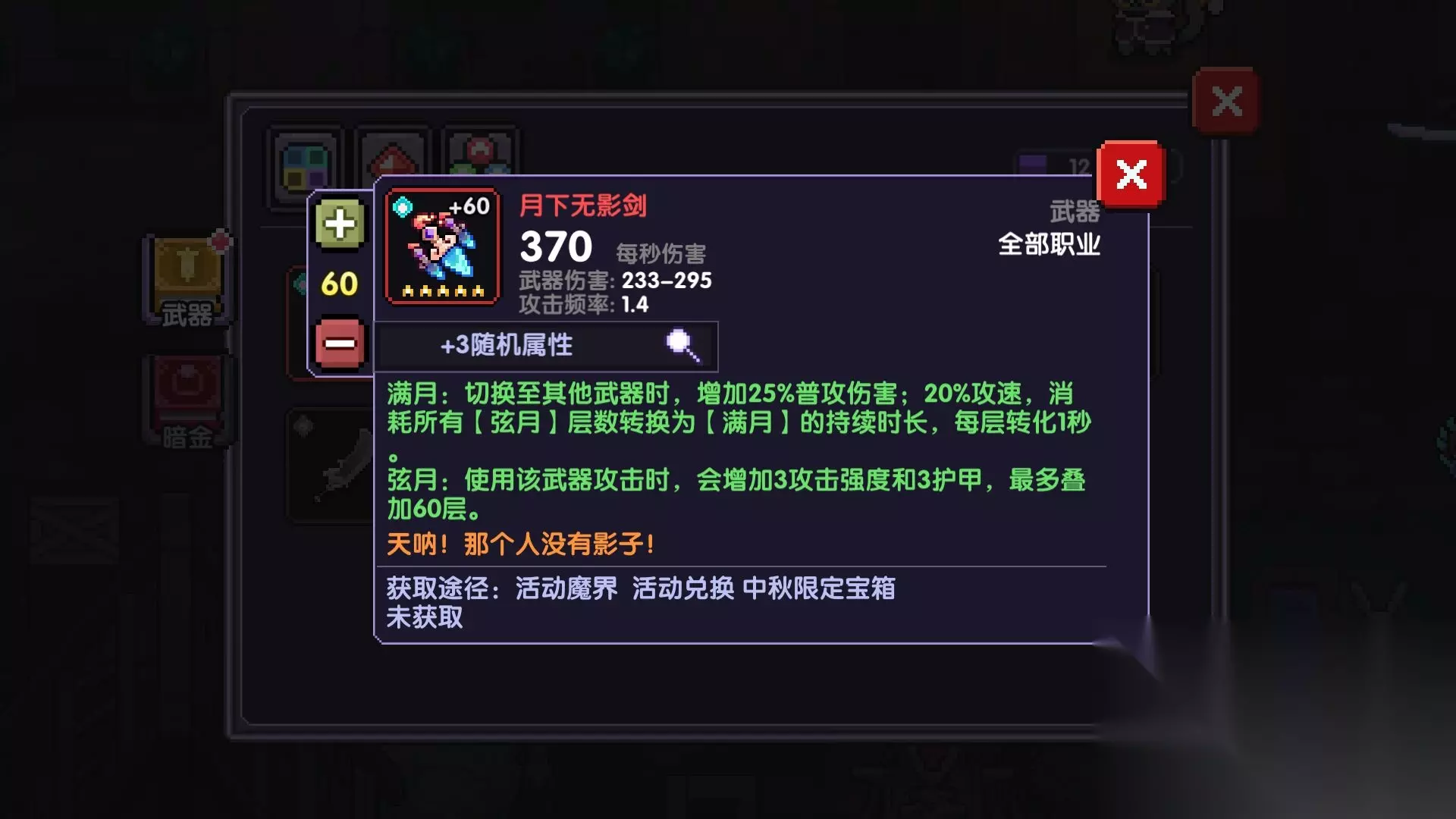 限定职业 无 武器品质 红色超越级武器 武器最大等级 五星60级强化 获得途径 魔界挑战碎片、中秋节活动兑换、武器宝箱抽取 武器介绍 天呐,那个人没有影子 武器伤害 最小攻击233最大攻击295,攻速1.4,平均每秒370伤害 克制关系 克制所有火属性怪物 武器技能 满月 切换到其他武器的时候,增加25%普攻和20%的攻速 弦月 该武器进攻的时候,会增加3攻击强度和3护甲,最高叠加60层 总结: 相信很多玩家都已经知道,这把武器的属性加成主要就是攻击和攻速,也就是说,这把武器很适合游侠这个职业,毕竟游戏中游侠的技能没有牧师和战士那么有特点,所以玩家也只能在走位和攻击上面下功夫了,所以下边个人认为这把武器给游侠是最好的选择。