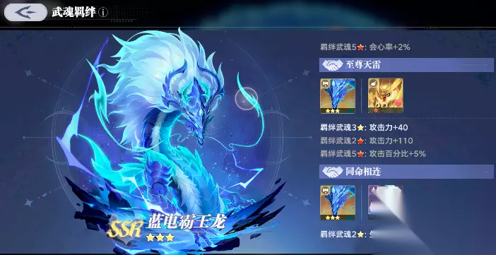 至于斗罗大陆猎魂世界蓝电霸王龙阵容方面,比较推荐搭配SSR金羽猫鹰,也就是路重华,猫鹰的魂技可以稳定挂感电效果,在这样可以打出更多的追击伤害。而且这两只武魂放在一起还可以激活“至尊天雷”的羁绊,获得攻击力加成。