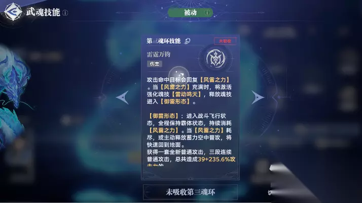 奥义是从高空砸向地面的大范围伤害,解锁第四魂环后还可以使用另一个奥义,降下数道落雷同时攻击周围目标,如果已经解锁雷霆万钧则会进入御雷形态,恢复50%的风雷之力,这个奥义还有二段,伤害倍率也很高,但使用后会立刻退出御雷形态。