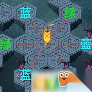通路一共6条,每条路上一个按钮,不是绿色的,就是蓝色的。 三个绿色按钮可以打开一个传送阵,三个蓝色按钮打开领一个传送阵。 这个副本需要打两次才能完成。中间需要结束一次,再开始。