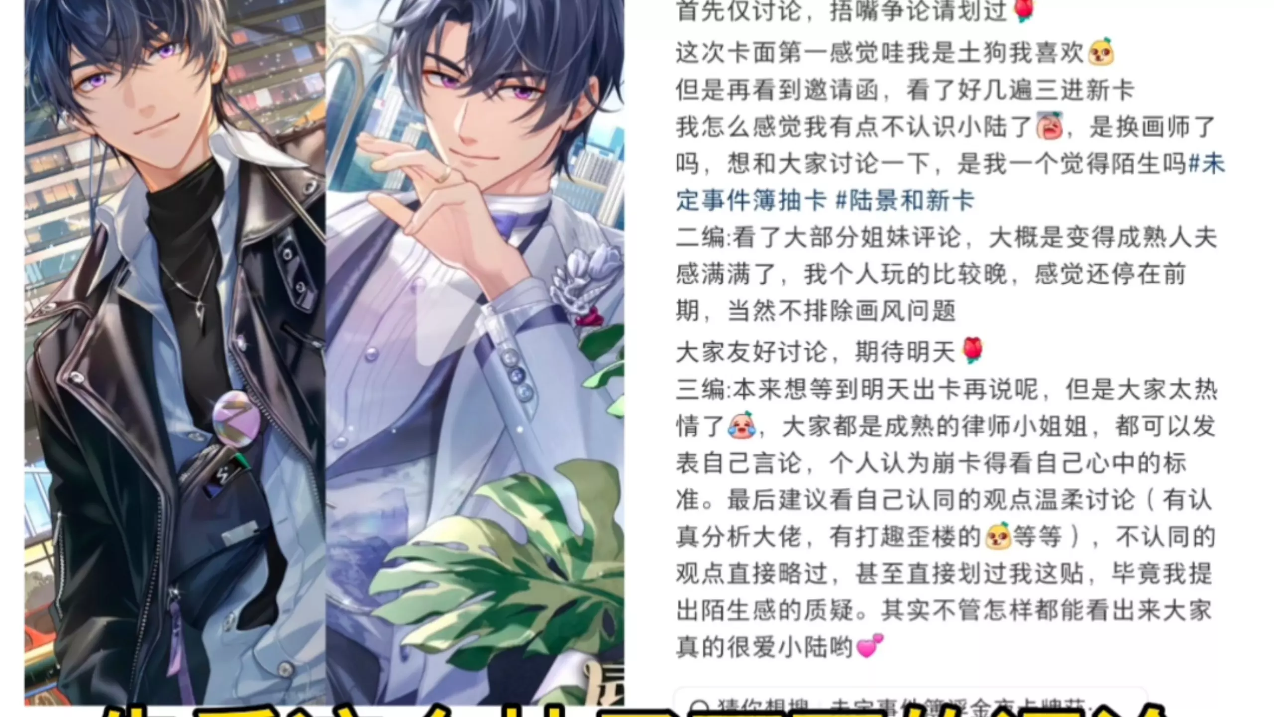 有玩家吐槽乙女游戏《未定事件簿》的白情MR卡,不满主控占比过大,还有玩家对卡面中莫弈的形象细节提出质疑,发帖人表示每次出卡都有这类争议,感到很无奈。