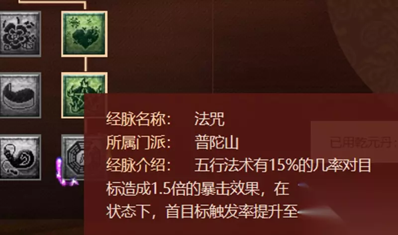 第四层推荐:法印(配图的经脉模拟器显示错误) 第五层:灵动、雨润、莲心剑意 其实灵动和雨润的效果都不错,但是这层没得选了,莲心剑意是咒师普陀的主力输出丹。使用后进入一个状态,然后五行法术伤害结果提升法修*3%。 效果很强大,算一算点到第五层经脉了怎么也得有20法修吧,这就提升60%,原本点选秒2000的现在能秒3200,提升明显。
