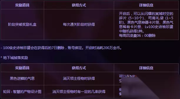 黑色魔物庭院进入方法 黑色魔物的庭院为总共有20阶段的多层构造地下城。 * 在特定日期的特定时间内,赋予可以挑战地下城的时间。 └ 可以入场的星期 : 星期六/星期日 └ 可以入场的时间 : 08时,10时,12时,14时,16时,18时,20时,22时,24时 └ 地下城可以挑战的时间 : 从可以入场时间开始的10分钟 - 在可以挑战的时间内从地下城中撤退后,再次入场时,进入已经通关的最后阶段的下一阶段。 - 当变更地下城可以挑战的时间时,初始化以前通关信息,从1阶段开始重新进行。 - 每帐号周仅限获得1次每个阶段的地下城通关奖励。 - 即使地下城挑战可以时间结束,也可以通关正在进行的地下城。 - 存在5分钟挑战地下城的限制时间(超过时间时,地下城通关失败,强制移动至地下城外部) 黑色魔物庭院奖励一览