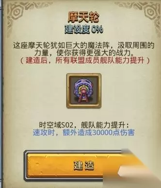 摩天轮:时空域S02,舰队能力提升:速攻时,额外造成30000/60000/90000点伤害;3级解锁小行星特殊事件【地下工厂】 获得 混合体B型 编制+1