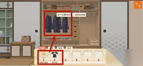 2、打开衣柜,将底栏的衣服拖上去,就能放入衣柜。注意左边是放衣服的,右边是放裤子的,如果提示有点偏,就是放错位置了。