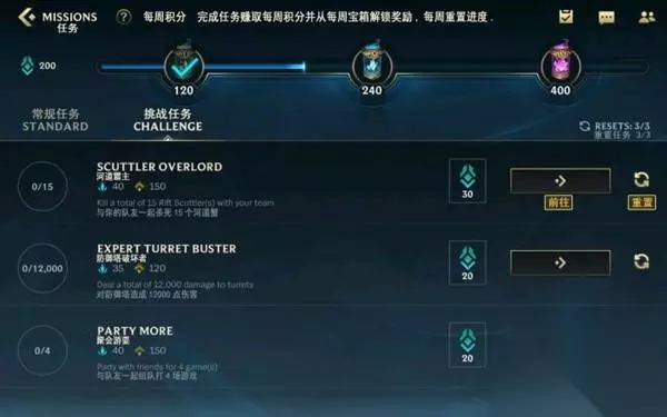 比如上图中就出现了河道霸主、防御塔破坏者、聚会游耍这三项任务,具体要求的翻译也在图中给出了。 这张图中的挑战任务则是与英雄定位有关的,分别是精英坦克、精英射手、主力坦克。 玩家每天还将有3次通过重置来更换任务的机会,可以刷掉自己不想做的挑战任务或者尝试刷出奖励更好的任务。