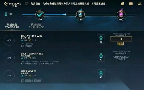 常规任务 每日第一胜:赢得1场比赛 奖励:蓝色精粹+30经验值+125 奖励:蓝色精粹+30经验值+125 使用表情:累计3场游戏中使用表情 奖励:蓝色精粹+30经验值+125 如果玩家达到了10级,还将在常规任务之外解锁额外的挑战任务,挑战任务的要求也会更多多样化。