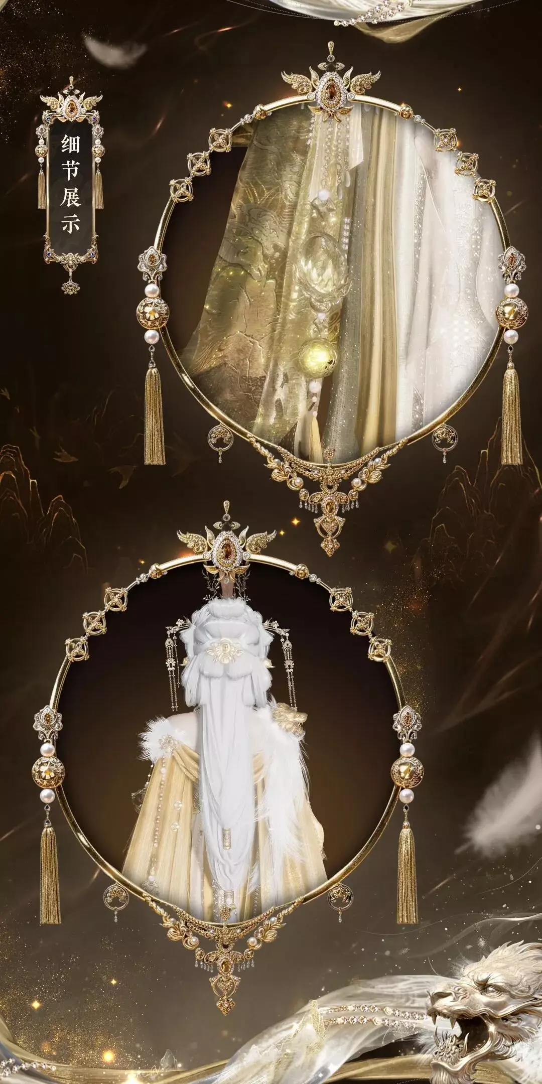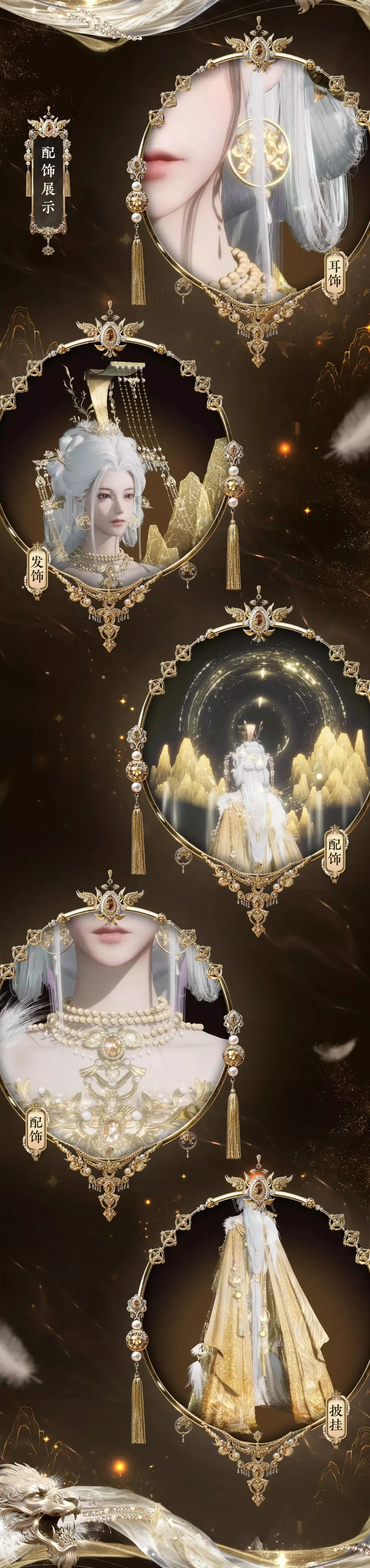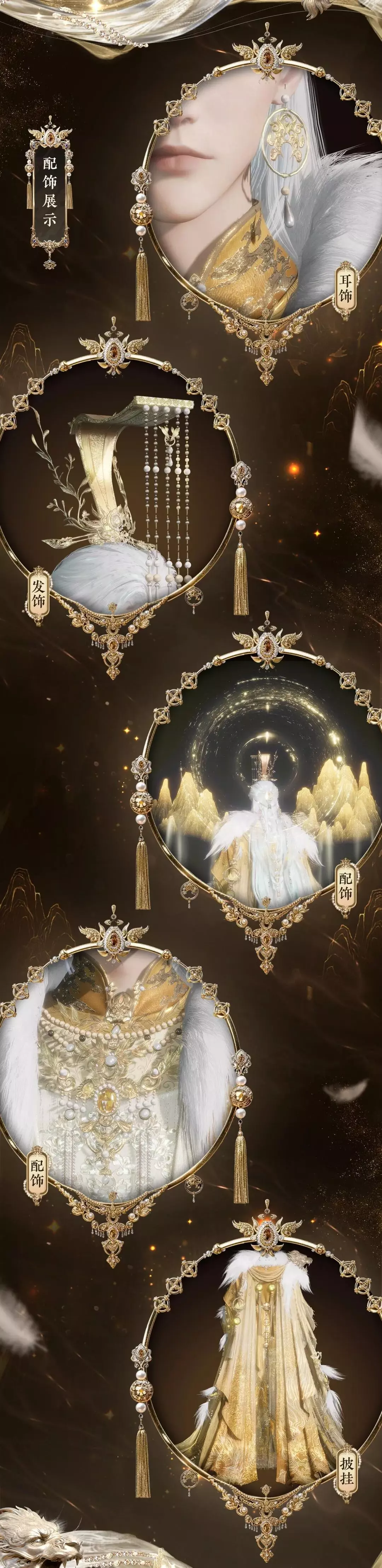 此套装将瑶天中的星月浩渺皆融于其中。女款身前、袖摆皆有月影轻纱。衣间似有玉露凝结,斗笠流转间,月色悬光漫散,自成清逸之境。男款衣间以乌云纹样衬星月点点,斗篷垂落如远山覆云,银质配饰流溢而下,明暗相生间尽显星汉灿烂的浩渺气韵。