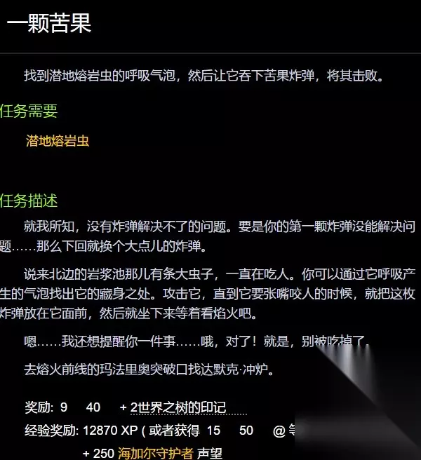 魔兽世界一颗苦果可以直接都商店里面购买,购买之后可以帮助玩家完成相关的任务,例如击败潜地熔岩虫的呼吸气泡,就有机会领取经验值、世界之树的印记、声望值等奖励。