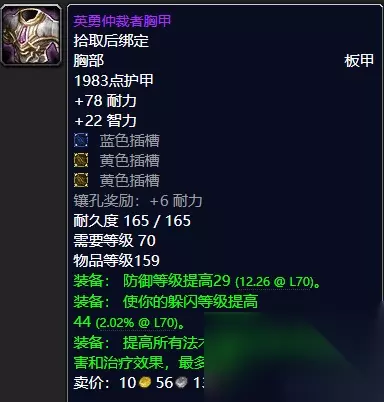 安东尼达斯的破碎斗篷 血色珍珠披风系太阳之井高地BOSS艾瑞达双子出品。 安东尼达斯的破碎斗篷系太阳之井高地终极BOSS基尔加丹出品。 其实很多人会问为什么会出现安东尼达斯的破碎斗篷,这个我想专业的防骑玩家也该都明白其中的原由吧,一般佩戴安东尼达斯的破碎斗篷的防骑前提是基本上已经防御等级达标免爆了,所以在后面对于血量、护甲、招架、躲闪亦或者法伤的追求上来说可以根据个人的喜好来搭配。所以不要惊讶一些防骑玩家后期和法系抢披风,这没有什么不合理,反而穿上后还很好用,你说气不气人,至于血色珍珠披风的话对于战士和防骑来说都是可以的,毕竟高耐高躲闪值得推荐,推荐指数统统满天星辰直戳天花板。 ⑤胸部装备:英勇仲裁者胸甲、光明使者护胸