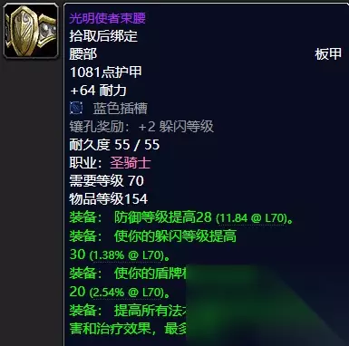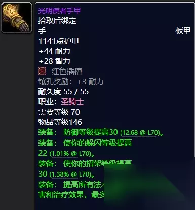 光明使者手甲 堡垒手套系太阳之井高地BOSS菲米丝出品。 光明使者手甲系圣骑士T6手部装备。(海加尔峰BOSS阿兹加洛掉落) 堡垒手套顾名思义,你穿上它之后就像堡垒一般坚不可摧,可谓是团队的顶梁柱,勇敢地站在BOSS之前,无畏生死,颇有一夫当关万夫莫开之气势可谓非常的威武霸气。而再看我们的光明使者手甲圣光加持,乌瑟尔为它代言,你值得拥有。推荐指数统统满天星辰直戳天花板。 ⑧腰带:光明使者束腰