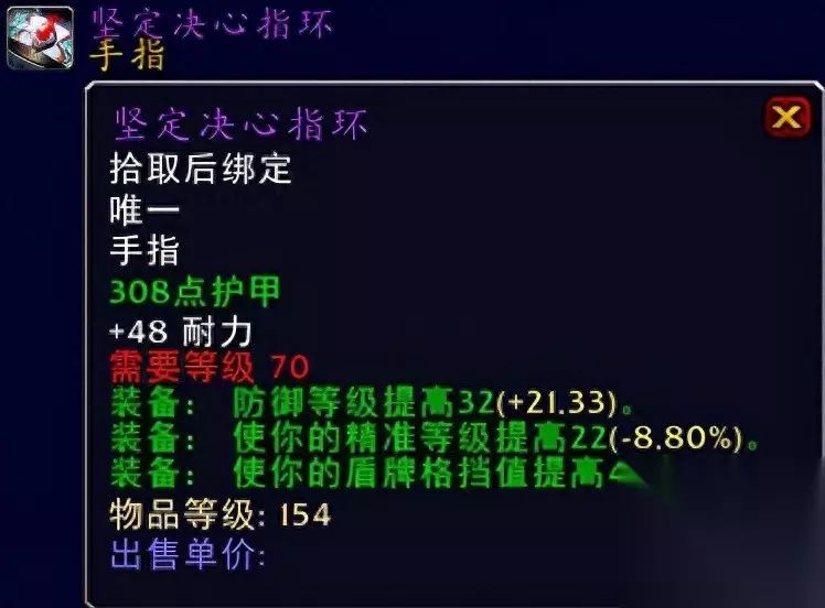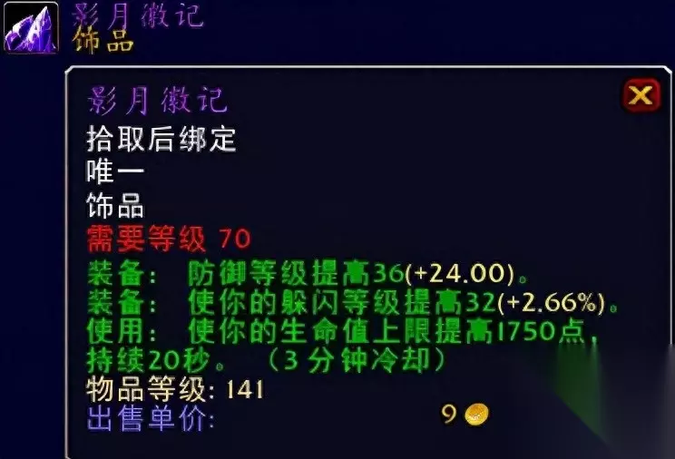 深渊领主指环 永恒防御者之戒系海加尔峰任务戒指。 坚定决心指环系太阳之井高地BOSS穆鲁出品。 深渊领主指环系黑暗神带你BOSS苏普雷姆斯出品。 这三款戒指的话相对来说喵叔个人认为是比较经典的款式了吧,无论超强的耐力加持还是说装备效果来看都是非常的不错,大家可以根据自身装备属性的需求来搭配,当然如果你拿不到的话那么就没有啥好说的了,当然喵叔的话也见过很多防骑会选择带法伤戒指(前期其他防御向属性满的情况下),但是喵叔个人就戒指这块的话并不是很推荐,主要还是推荐这三款主流防御向的戒指给我们的防骑玩家,希望喜欢,经典戒指款款永流传,推荐指数满天星辰直戳天花板。 ⑫饰品:影月徽记、坚硬的纳鲁薄片、凯尔萨斯的赞誉、偏移甲虫、莫罗斯的幸运怀表