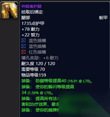 光明使者腿甲 仲裁者护腿系太阳之井高地BOSS玛里苟斯出品的神圣信仰腿铠加太阳之尘换取。 光明使者腿甲系圣骑士T6套装腿部装备。(黑暗神殿伊利达雷议会掉落) 黄金护腿仲裁者护腿你值得拥有,无论是78点的超强耐力还是40点的无敌防御等级提高亦或者是34点的躲闪等级提高都无疑是你最为优秀的护腿了且没有之一。推荐指数满天星辰直戳天花板。 当然我们光明使者腿甲对于一般的玩家来说已然够用,有时候安于平淡兴许就是福气,推荐指数满天星辰。 ⑩鞋子:光明使者战靴