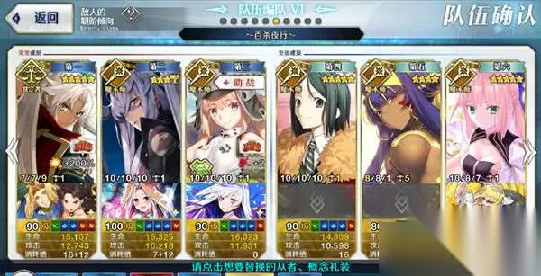 前两面各三个枪阶小怪,第三面为51万血的斯卡哈和30万血的库丘林。斯卡哈进场时给玩家全体宝具封印三回合,二人中任意一个被击败时,剩下的一个获得攻击力提升50%,暴击率和爆伤提升100%,敌方全体500%概率即死,普攻时80%概率具有使目标80%概率即死的效果。 以前这一关最好的打法是同时压两个人血线然后一个光炮带走以防单人buff太强。现在同理,不过以现在的从者性能应该很容易就能一个宝具秒了,只要带个免疫或者技能解弱解除宝具封印即可(c呆的宝具解弱不行,自己被封了是点不出宝具的) 3、百杀夜行