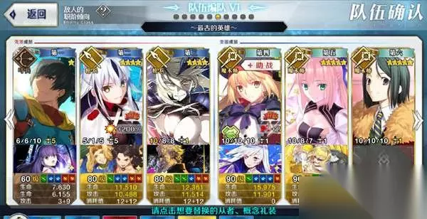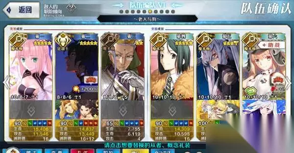 第一面第二面为3个骑阶小兵,第三面为车轮战,41万血的梅芙和五个骑阶小兵、两个术阶精英小兵轮流上场。梅芙持有加防和耐性等防御buff,很难直接打出伤害,需要击败第三面的7个小兵削弱梅芙buff。 由于大部分是骑阶敌人,携带杀阶打手比较好打,只需要注意应对最后两个术阶即可,双面人也是个好选择,ae杀生院宝具有无视防御,带上倍卡之后打满buff梅芙也有很高伤害。 6、最古老的英雄