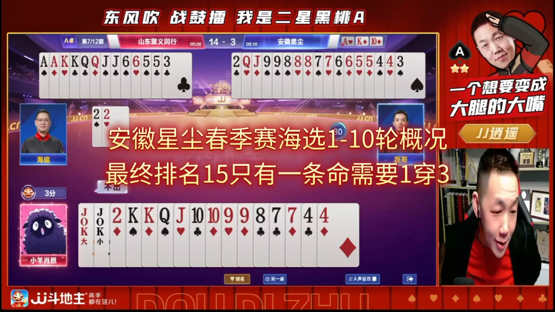 JJ斗地主冠军杯S7春季赛海选海底安徽星尘1到10轮概况,最终安徽15,山西17暂时晋级,只有一条命,需要1穿3才能正赛