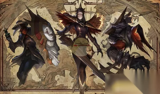 沃里克曾经是一个威名显赫的骑士,如今他发誓要效忠于丽桑卓。为了获得沃里克的忠诚,丽桑卓给予他一块特殊的月光碎片,诅咒他终将有一天被刺穿心脏,并且坠入堕落的深渊。送葬者约里克是一个可怜的家伙,他被诅咒必须埋藏这个都市里的各种秘密。各种令人不快的事情困扰着约里克的头脑,而他也逐渐被丽桑卓的无尽野心感染了。 其实,回顾这个黑暗预兆的故事,应该是蚀宇宙的人类已经知道有丽桑卓这个女巫的存在,他们以丽桑卓为邪恶的化身,撰写了这个寓言故事,警惕人类丽桑卓终将会归来,将人类带入到黑暗深渊之中。或许,这个寓言故事有部分也是真实的,比如丽桑卓真的曾经为了永生力量,而出卖了人类堕入黑暗之中。 包含皮肤:刀锋女王丽桑卓、黑色天灾辛吉德、恶咒亡魂魔腾、钢铁审判官凯尔、地狱送葬约里克、暗影沃里克