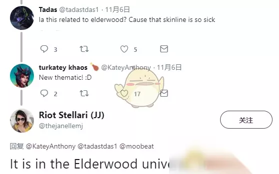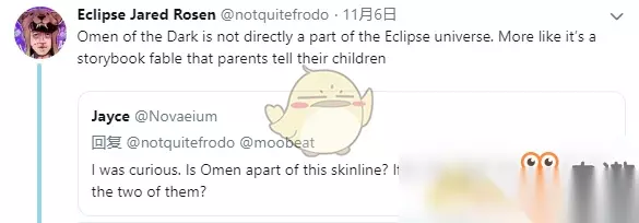 而皮肤团队的首席作家Jared Rosen则是谈到了“Omen of the Dark(黑暗预兆)”系列皮肤,黑暗预兆皮肤虽然属于Eclipse蚀宇宙,但并不是直接的组成部分,类似于父母讲述给小孩听的一些童话寓言故事。黑暗预兆不是单独的一个命名皮肤,是由多个皮肤组成的一个系列。