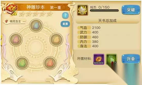天书升重 天书需一重一重的研习,当前重数融入所有“精要”后开启下一重,每重研习都需要融入数个“精要”,融入指定“精要”可增加属性,当卸下精要时,将返还融入该精要所消耗的阅历。升重升重培养需消耗一定的铜币与升重符,升重符可通过帮派内兑换或参与活动获得。