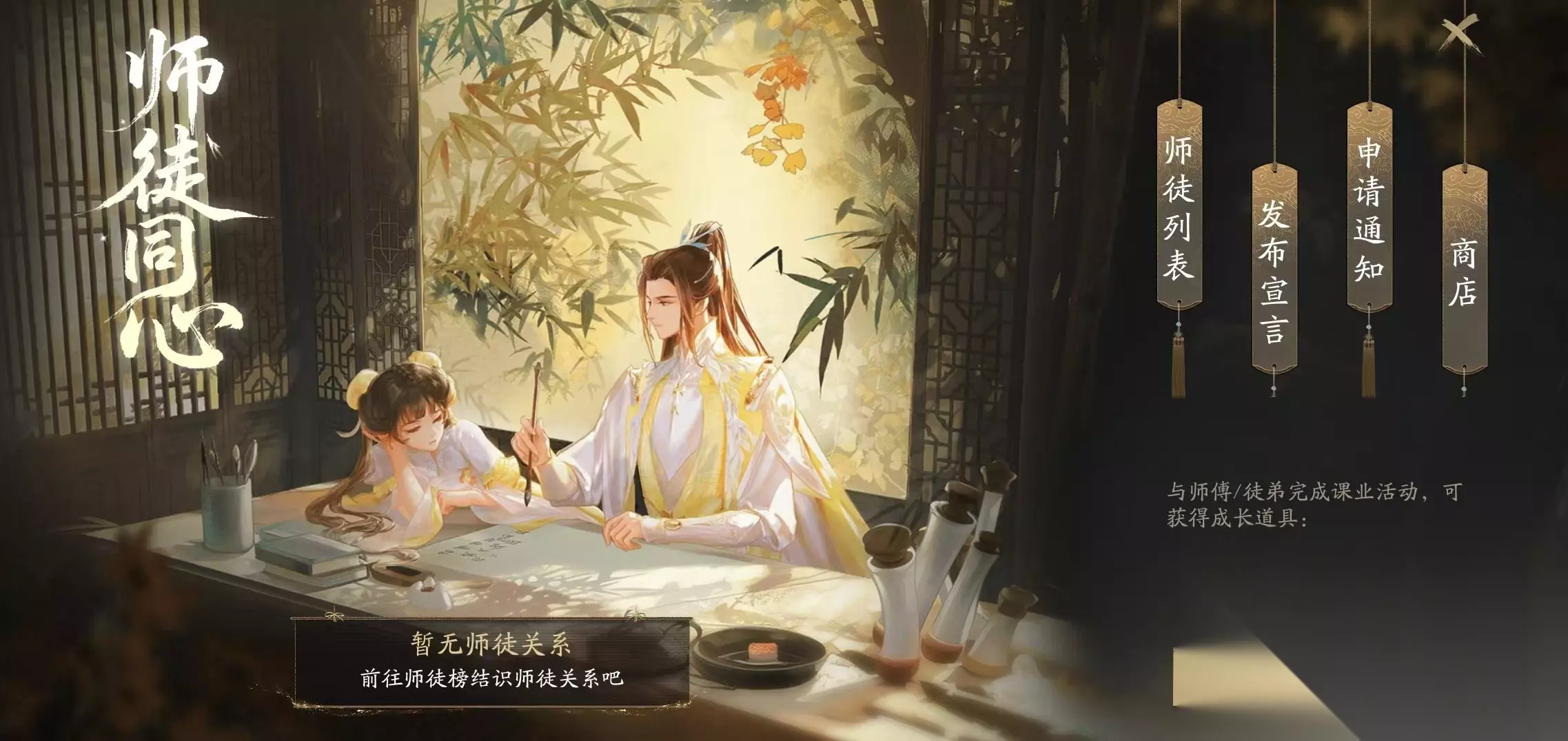 师徒双方还可共同参与多项限定玩法——如策略性五子棋对弈、沉浸式师门后院互动,以及仅限师徒二人开启的“传功”功能。该功能直接强化徒弟基础属性与技能效果,是战力跃迁的关键助力。此外,组队协作时,师徒亲密度随共同活跃度持续增长,亲密度越高,副本掉落加成与经验获取效率越优;师傅成功培养多名徒弟出师后,还将解锁专属称号及对应特权,彰显师道成就。