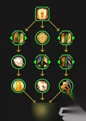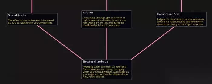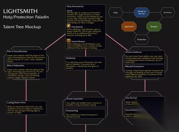 一、基础天赋 圣光军备:圣光凝聚在目标区域成为圣光武器,可供你和盟友使用。在神圣壁垒和神圣武器之间切换。使用后持续20秒,两层充能。 神圣壁垒:装备时获得15%最大生命值的护盾,并且每2秒额外获得5%,最多叠加至30%。 神圣武器:装备时,你的法术和技能有几率额外造成神圣伤害和治疗。 二、第1层 选择节点:圣化仪式 / 裁决仪式 圣化仪式:为你的武器注入圣光之力,使你的护甲值提高5%,主属性提高1%。也灌注在圣光军备中。 裁决仪式:为你的武器注入圣光之力,使你的耐力提高3%,消耗神圣能量的技能有时会在目标周围释放一股治疗波。也灌注在圣光军备中。 团结一致:如果一位盟友捡起了军备,你也会获得它的增益效果。如果你捡起了军备,你周围的一位盟友也会获得增益效果。 选择节点:神圣引导/祝福庇佑 神圣引导:你每消耗一个神圣能量都会使下一个奉献造成分摊的额外伤害和治疗,有固定上限。 祝福庇佑:施放消耗神圣能量的技能会使你的下一个十字军打击,祝福之锤和正义之锤的伤害和治疗效果提高100%。 三、第2层 放下武器:当一个军备消失时,圣疗术的冷却时间减少15秒,且使你获得圣光灌注或闪耀之光。 选择节点:神圣启发 / 事先警告 神圣启发:你的法术和技能有几率在周围显现出一个圣光军备。 事先警告:圣光军备的冷却时间减少20秒。 选择节点:无惧邪恶/严厉痛斥 无惧邪恶:装备军备时,恐惧效果的持续时间减少50%。 严厉痛斥:正义之锤5码内的敌人减速15%。 四、第3层 共同决心:你激活的光环效果对装备军备的人效果提高33%。 骁勇:消耗圣光灌注或闪耀之光会延长当前激活的军备3秒持续时间。如当前没有军备存在,则减少军备3秒冷却时间。 铁锤与铁砧:审判爆击时会目标位置触发一股冲击波,造成额外神圣伤害和治疗。 五、顶点天赋 熔炉祝福:复仇之怒会额外召唤一个神圣武器。复仇之怒期间,神圣武器会对目标施放法术并复制你的神圣技能。