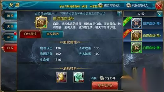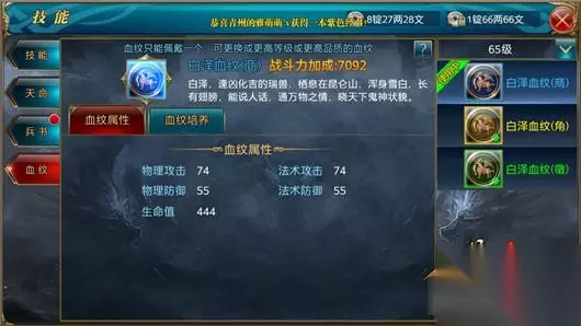 血纹的培养则需要消耗龙魂,可在部分活动中获取或使用南蛮武勋兑换,也非常稀少。但如果在有同样投入的情况下,推荐选择兑换龙魂,进行血纹培养,培养有较大几率出现暴击效果,获得双倍属性加成。
