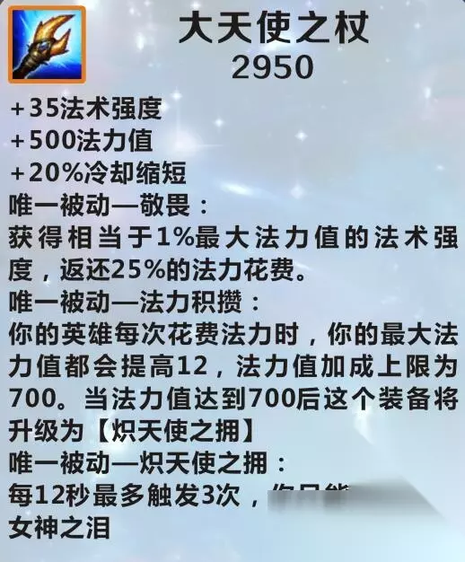 《英雄联盟手游》大天使之杖介绍 名称: 大天使之杖 售价: 2950 属性: + 35法术强度 + 500法力值 + 20%冷却缩短 唯一被动一敬畏: 获得相当于1%最大法力值的法术强度,返还25%的法力花费。 唯一被动一法力积攒: 你的英雄每次花费法力时,你的最大法力值都会提高12,法力值加成上限为700。当法力值达到700后这个装备将升级为[炽天使之拥]。 唯一被动一炽天使之拥: 每12秒最多触发3次,你只能携带一个女神之泪。