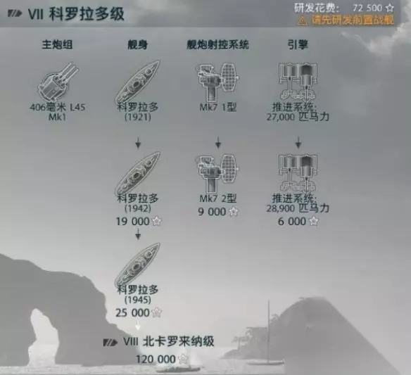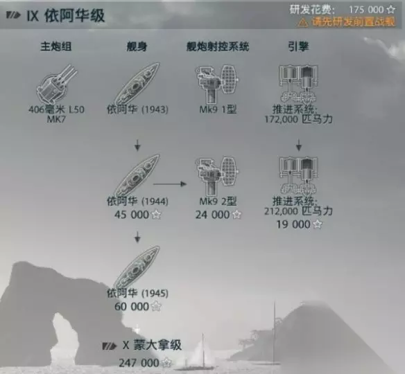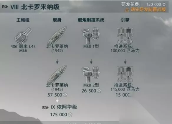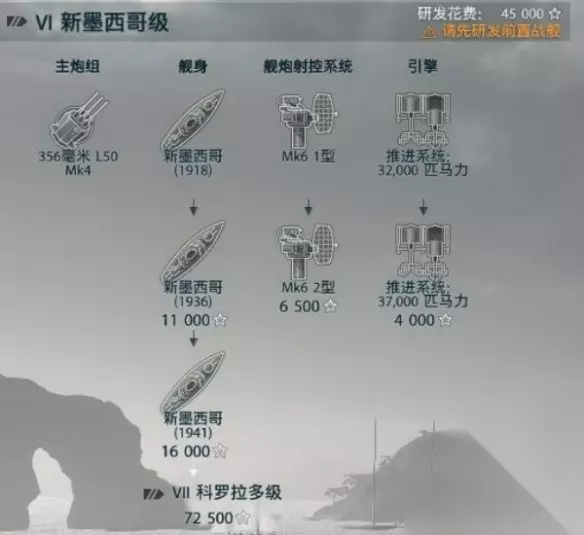 6级是美系战列舰非常强势的等级,拥有12门炮但航行速度依旧很慢,建议按照射程-船身-引擎-船身来点。
