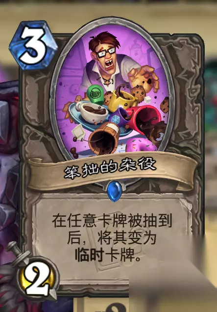 2、改牌思路: 如果环境中圣骑士比较多可以带笨拙的杂役来针对:
