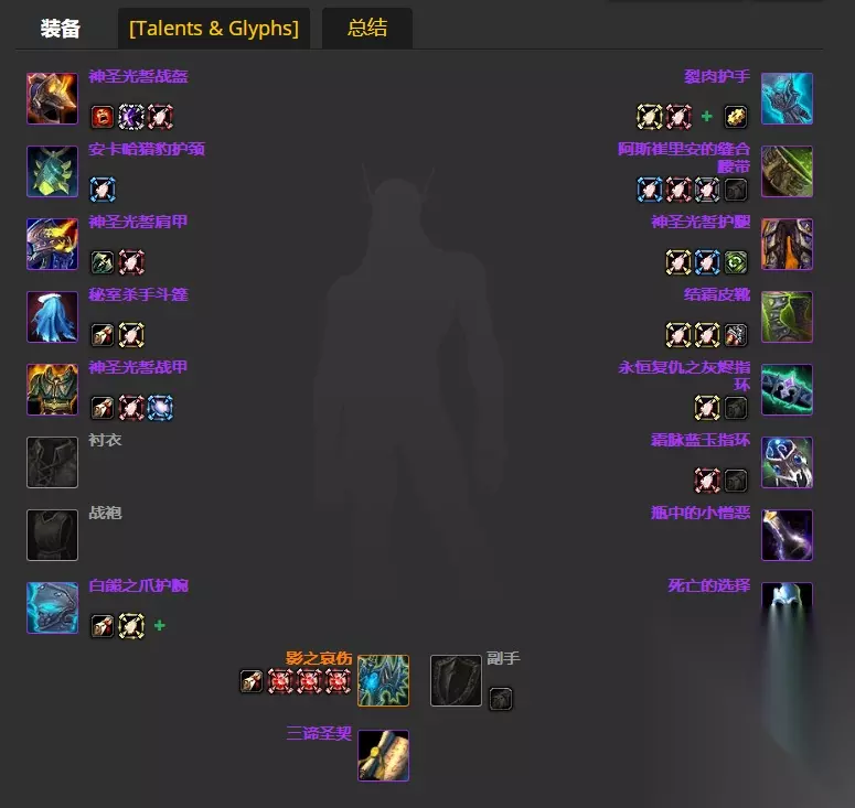 8、腿部 神圣光誓护腿 9、鞋子 结霜皮靴 10、项链 安卡哈猎豹护颈 11、戒指 永恒复仇之灰烬指环、霜脉蓝玉指环 12、护符 瓶中的小憎恶、死亡的选择 13、双手武器 影之哀伤 14、圣契 三谛圣契 魔兽世界wlk惩戒骑毕业装备推荐的全部内容就介绍到这里,更多魔兽世界相关攻略正在添加中,敬请期待!