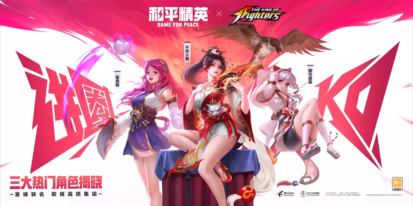 #和平精英刺激之夜全新IP联名重磅发布! 和平精英再度携手SNK官方三大热门角色现已揭晓! 不知火舞热情演绎,娜可露露空灵银发登场 雅典娜再换元气新装,格斗之魂…