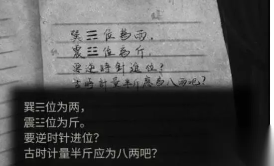 2、然后在笔记中我们可以了解,巽是两,震为斤,半斤等于八两,那么一斤等于十六两,然后说是要逆时针方向,那么就是从巽来算。