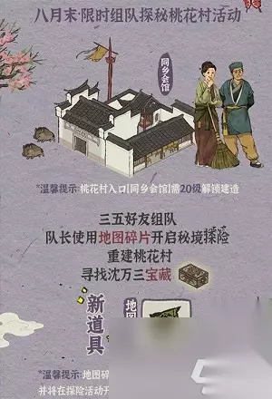 这个是游戏的组队玩法,需要玩家找到三五个好友然后组队,其中队长可以进入这个同乡会馆里面,使用这个地图碎片,然后开启这个秘境探险,进入桃花村里面,可以得到这个沈万三宝藏,里面有不少个好东西。