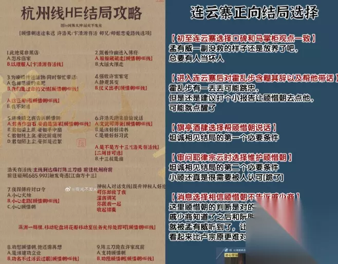 时间:2024年02月26日 逆水寒手游顾惜朝防黑化主线怎么选择?逆水寒手游顾惜朝正向结局怎么选?下面小编给大家整理了逆水寒手游顾惜朝防黑化主线选择攻略,快来看看吧! 逆水寒手游顾惜朝防黑化主线选择: 1.初至连云寨选择口碑和马掌柜观点一致: 孟有威一副没救的样子还是放养了吧,总要有人当坏人 2.进入连云寨后对霍乱步含糊其辞以及帮他带话: 霍乱步有一丢丢可能跳忠,但是还是建议打个小报告让顾惜朝去点他,可能就点醒了 3.旗亭酒肆选择帮顾惜朝说话: 坦诚相见结局的第一个必要条件。 4.审问耶律宗云时选择维护顾惜朝: 坦诚相见结局的第二个必要条件小顾还真是很需要被人认可。 5.消息选择相信顾惜朝不告诉戚少商: 这里顾惜朝的判断是对的,不能告诉戚少商,戚少商知道了之后和阮明正商量就被孟有威听到了,让朝廷派了新的人来看起来比卢宗原更难对付。有内鬼有内鬼。