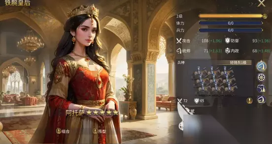 铁腕皇后:全能型的一位英雄,有108点攻击,主要是偏向于输出,虽然防御只有93点,但也可以支撑战场。微言大义这是核心的技能,没有cd,但是可以减少30%的弓兵伤害,在正面突破时总会拥有较好的优势。