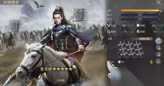霍去病:属于一个辅助性的核心,有104个攻击,还有104个防御力。全军冲锋的主动技能,可以有效提升80%的侧翼步兵速度,还可以给全体骑兵提供35%的减伤。在面对主流阵容时,10秒到12秒的远程免伤伤口还可以更好的保护输出。如果是和孙武搭配在一起,就可以和前排之间形成完美的衔接,在团队过程中也有出色的容错率。