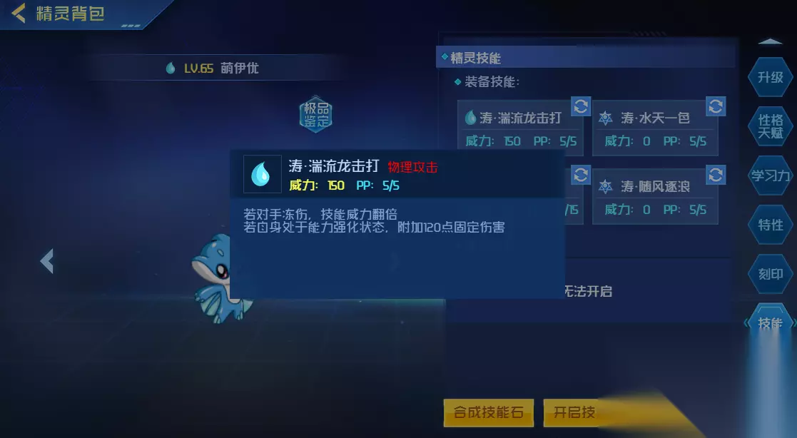 然后还有涛·湍流龙击打,如果对方被你冻住的话,用了之后可以让技能的伤害翻倍。并且自己处于强化状态时,可以附加120点的固定伤害。然后还有随风逐浪,这同样是一个必中的属性攻击,在三回合内自身的免疫力会下降。