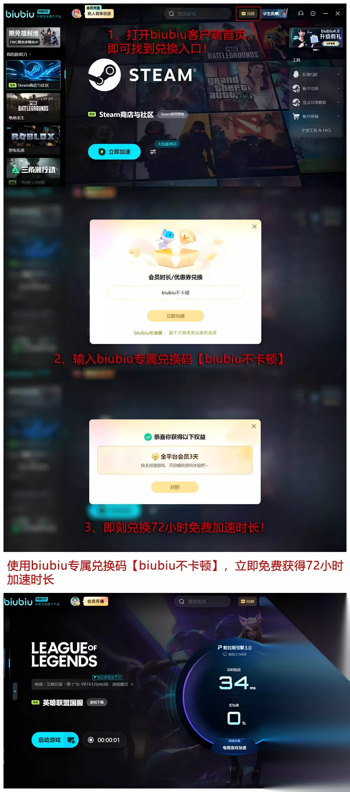 【biubiu不卡顿】支持连续加速时长达72小时,新用户注册即赠24小时体验资格,累计可享96小时有效加速时长。全部权益以四天总时长形式发放,且支持分段使用——未主动领取口令前,剩余时长持续保留在账户内,随时按需启用。