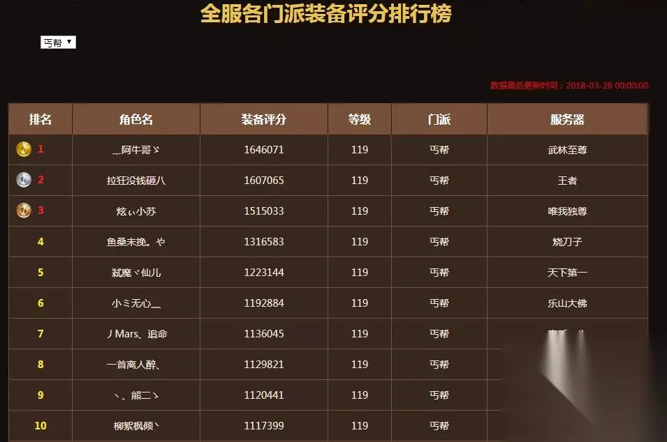 丐帮第一还是阿牛哥,最早的就是斗魂枫丐帮。当时的【武道至尊】服务器可以说是极其强大,排名前二十的人中有五个人都是来自【武道至尊】服务器。