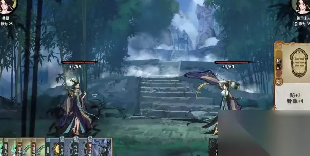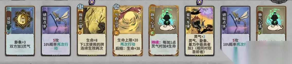 2、将卡牌按照静气心法—静气心法—气贯长虹(升1级)—气贯长虹(升1级)—兑卦—气疗术—气疗术—枯木逢春的顺序摆放,完成战斗。