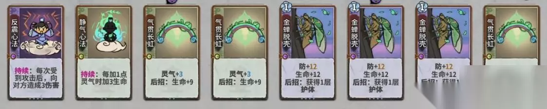3、进入卷二开启挑战,将卡牌按照反震心法—静气心法—气贯长虹—气贯长虹—金蝉脱壳—金蝉脱壳—金蝉脱壳—气贯长虹的顺序摆放,完成战斗。