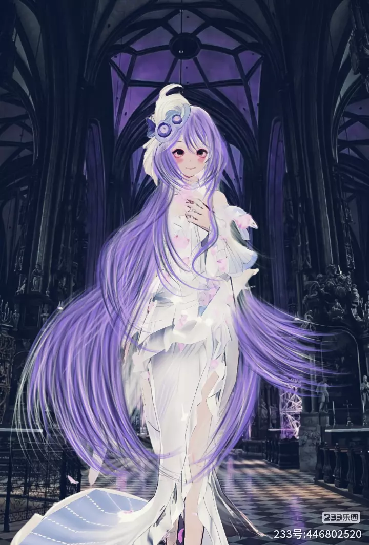 配饰与装饰:长发为通透的淡紫渐变,发间别着白色花苞发饰;背景是暗黑哥特式教堂穹顶,交织着银色蛛网状光纹,白纱的柔美与教堂的冷峻碰撞,再加上紫发的梦幻质感,强化了空灵又诡谲的视觉效果。#吗喽精选 #申请精华 #创作月榜