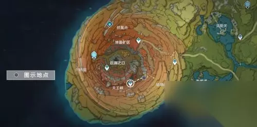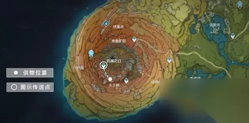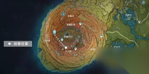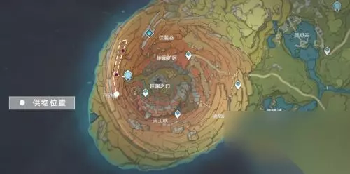 传送点旁边有一个矿洞。我们不用进矿洞,我们爬上旁边山岩的顶部。 爬上山岩的顶部以后,再爬上一个山岩的顶部。 在山岩顶部的奉坛,【调查】得到一件供物,岁时之冕。 第3件供物 这件供物在很高的山顶上。 我们从七天神像出发,图示路线前进,前往供物的位置。图示红点是“风板”。 我们借用“风板”可以快速攀爬上山顶。在前往供物位置的路上,我们一共遇到两个“风板”。